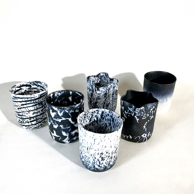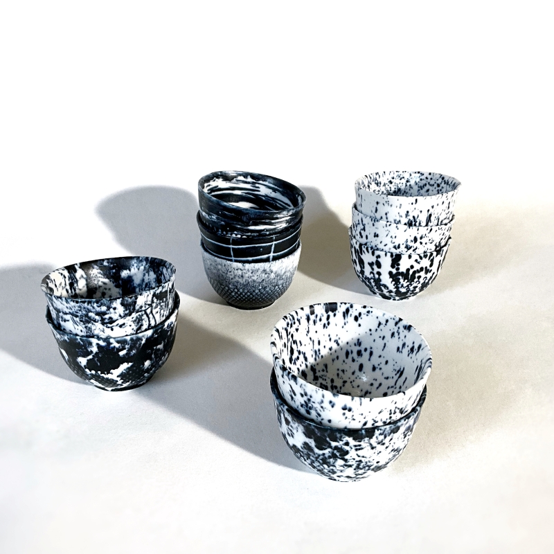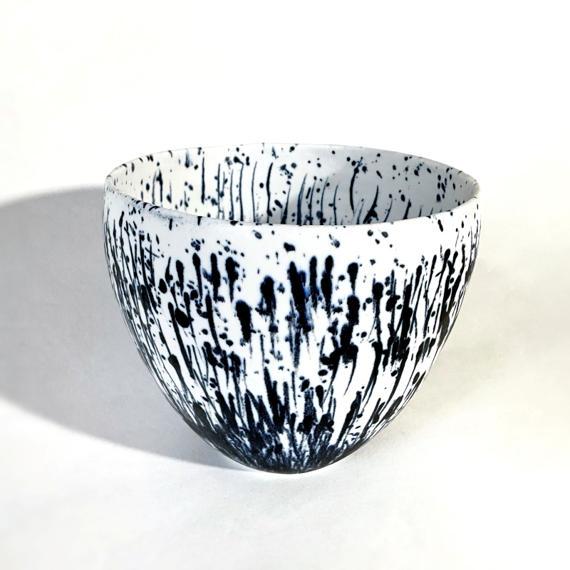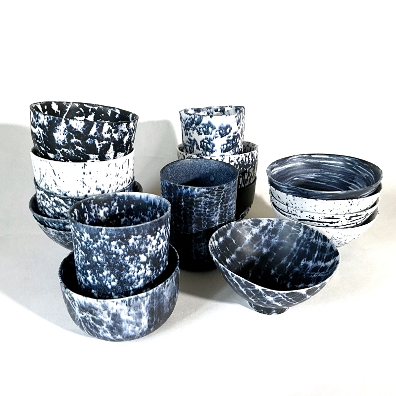 Je propose des pièces « Art de la Table », en porcelaine, réalisées à la plaque ou en porcelaine de coulage.Elles sont émaillées avec un émail bleu/noir et un émail blanc.Pour les motifs je déploie mon imaginaire par l’usage d’impressions tramées ou par le graphisme, en tracés dynamiques.