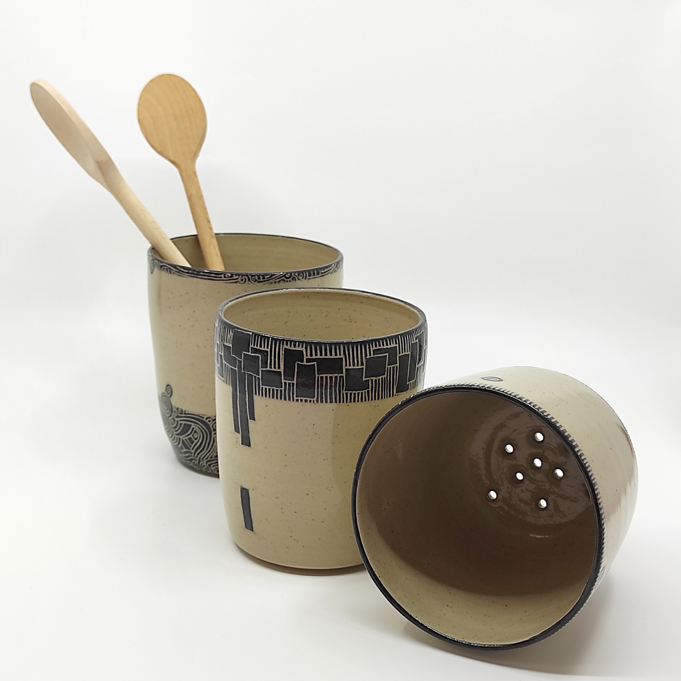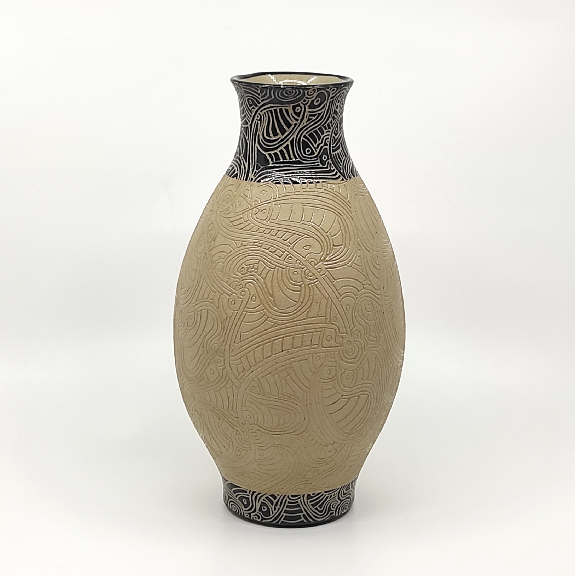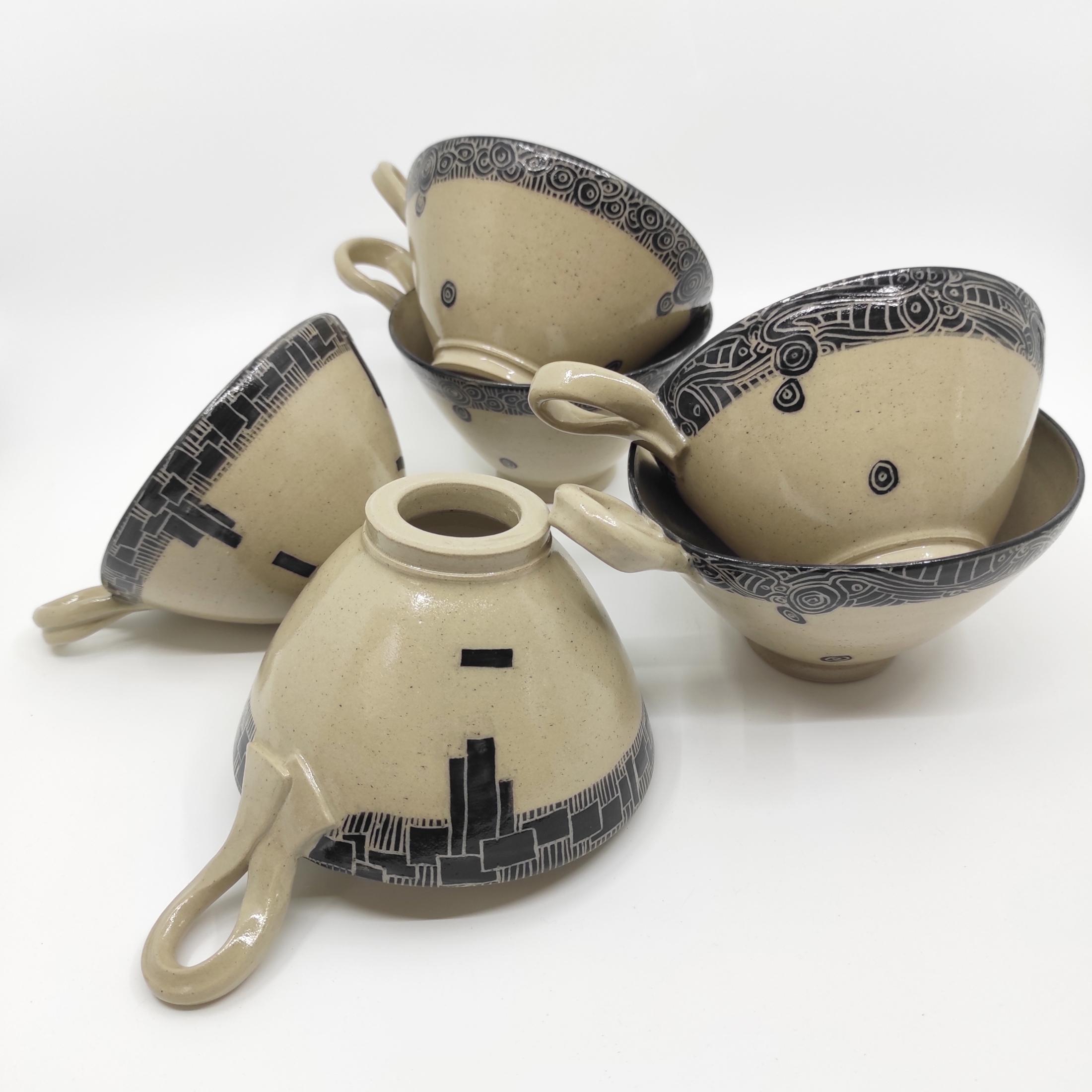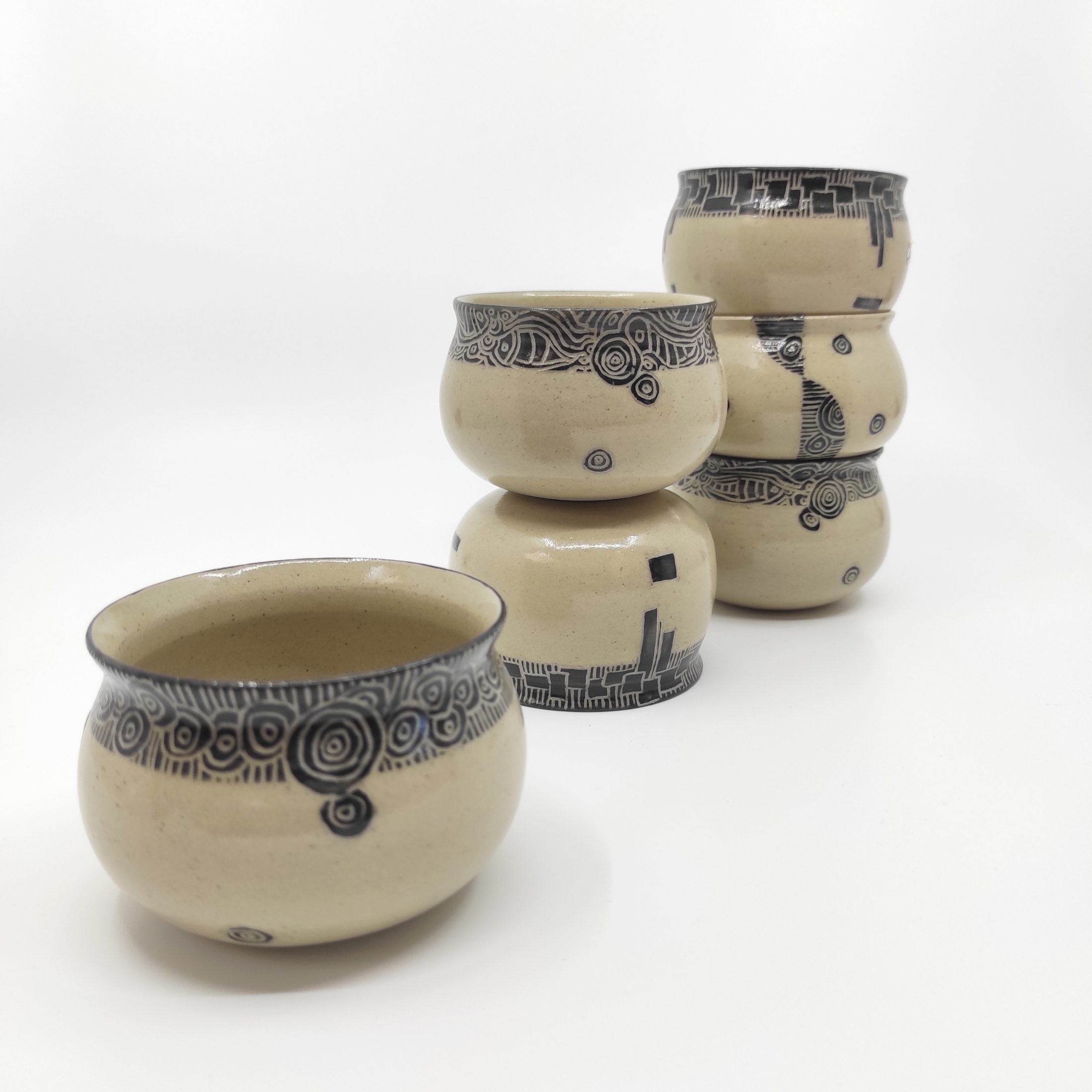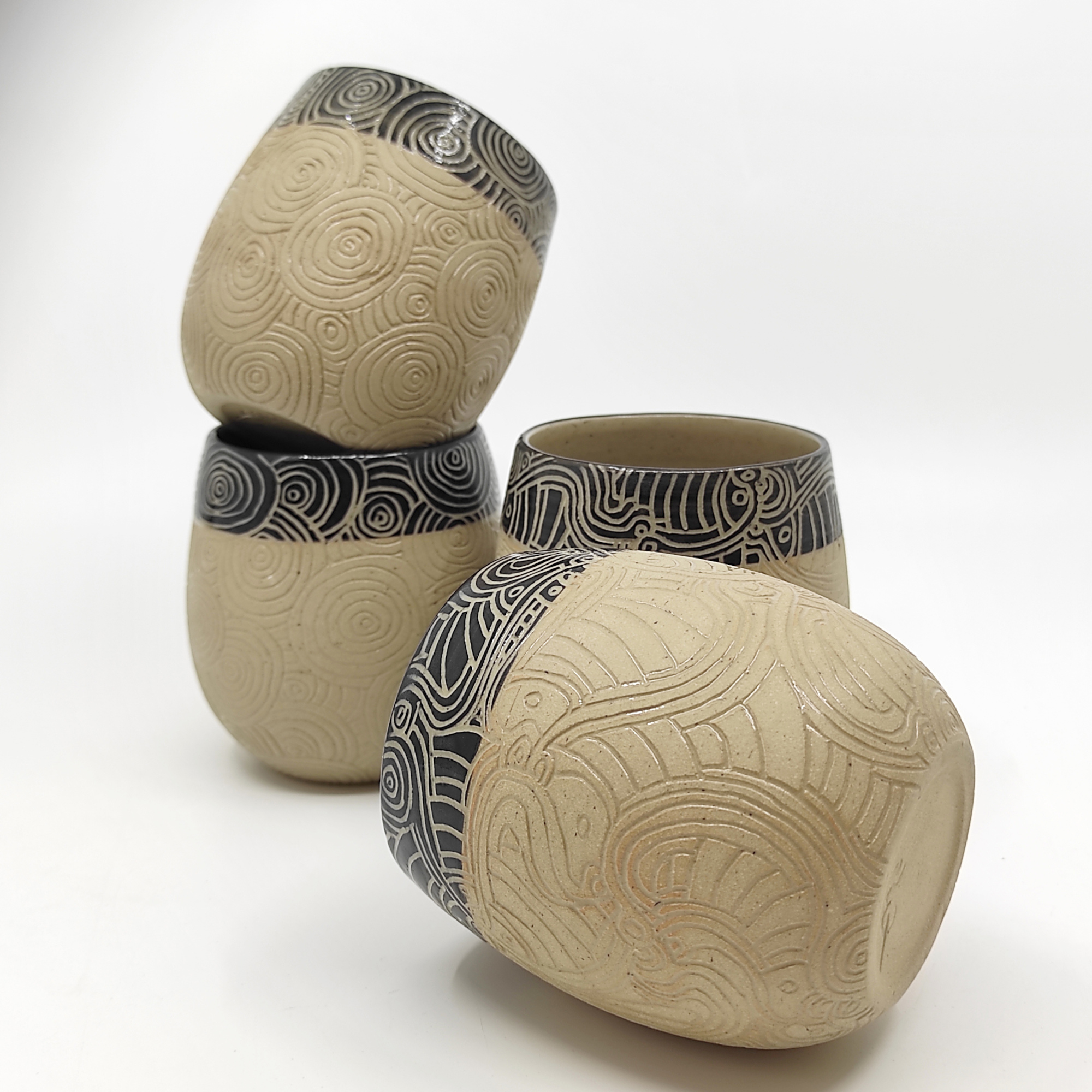 Je tourne mes pièces, en grès, j'applique un engobe noir et grave un décor fin et graphique dessus, tout est émaillé et cuit a haute température.Mon grès accompagne mes sculptures en porcelaine, un même univers, une recherche centrée sur la forme et le graphisme. Formes, lignes et contraste...